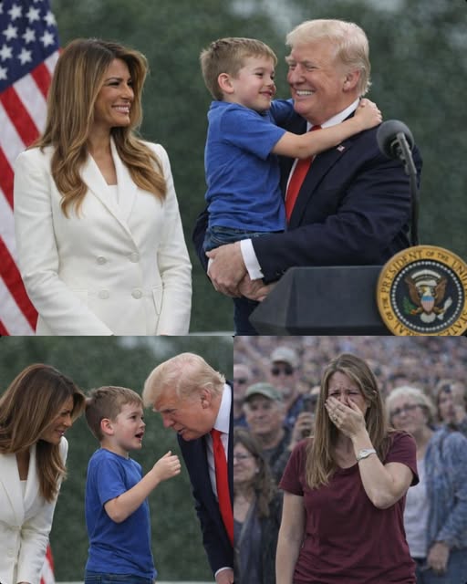 Both of them lowered themselves to the boy’s height, removing the distance that podiums and titles create. Trump leaned in and whispered softly, words meant only for the child. “This morning — this moment — is yours.” What happened next did not register immediately for most of the crowd. Melania reached out first. It wasn’t dramatic. There was no sweeping gesture, no display meant for cameras. She adjusted something small — the way the boy stood, the way he was held — guiding him gently, shielding him from the sudden weight of attention. Those closest noticed how her hand rested briefly at his back, steady, reassuring, as if anchoring him in place.